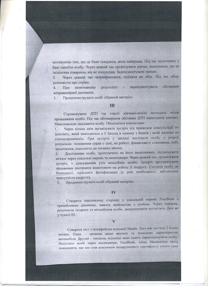 Есть и пара вариантов "ловли" через интернет: с фигурантом через Facebook знакомится красивая девушка. И способ, оптимизированный конкретно под банкира Лищука: акционное предложение для владельцев автомобиля Mazda: принять участие в тест-драйве (банкир водит Mazda CX-5). На этом тест-драйве и происходит знакомство с агентом.