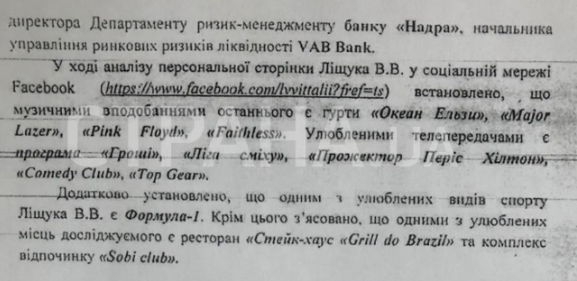 "В ходе анализа персональной страницы Лищука В.В. в социальной сети Facebook установлено, что музыкальными пристрастиями последнего являются группы "Океан Эльзы", "Major Lazer", "Pink Floyd", "Faithless". Любимыми передачами являются программа "Деньги", "Лига смеха", "Прожектор Перис Хилтон", "Comedy Club", "Top Gear"", - говорится в досье.