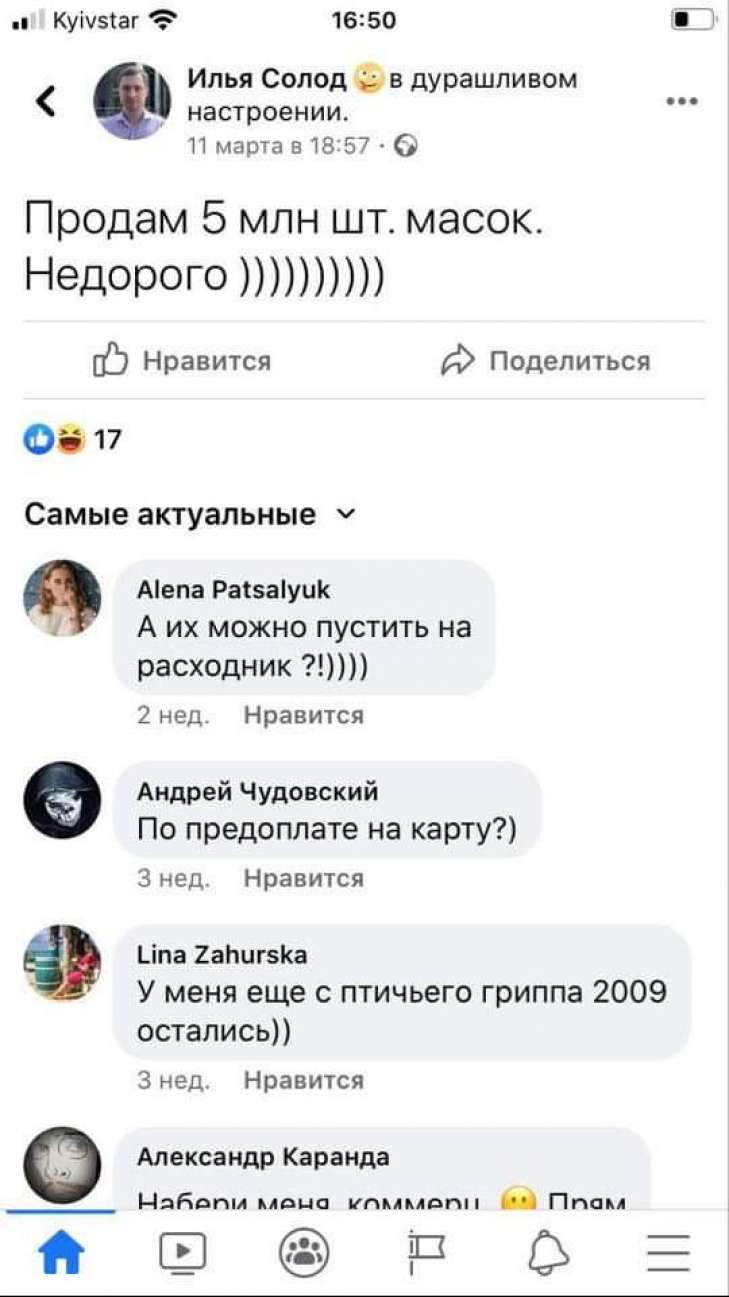 Ка сообщили волонтеры, помогающие врачам, некий Илья Солод поставлял маски, которые не соответствовали требованиям защиты.