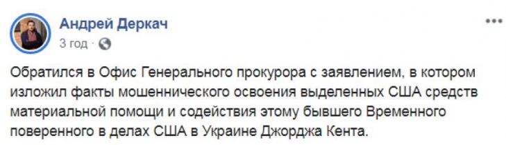 «Обратился в Офис генерального прокурора с заявлением, в котором изложил факты мошеннического освоения выделенных США средств материальной помощи и содействия этому бывшего временного поверенного в делах США в Украине Джорджа Кента", - написал Деркач.