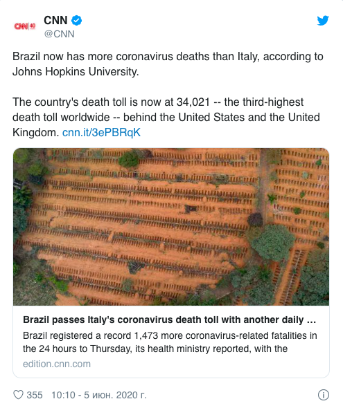 Согласно данным Worldometers, Бразилия по количеству жертв обогнала Италию, где число смертей составляет 33 689. Таким образом, Бразилия вышла на третье место по летальным исходам. Первое место у США (110 179), второе — Великобритания (39 904).