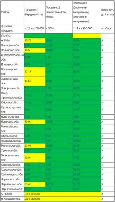 По состоянию на 9 июня к ослаблению карантинных мер не готовы Киев, Волынская, Львовская, Ровенская, Черновицкая, Житомирская, Закарпатская и Тернопольская области. Из перечня вышла Черниговская область, в которой еще 8 июня был высокий показатель инцидентности (количество заболевших COVID-19 за на 100 тысяч человек).