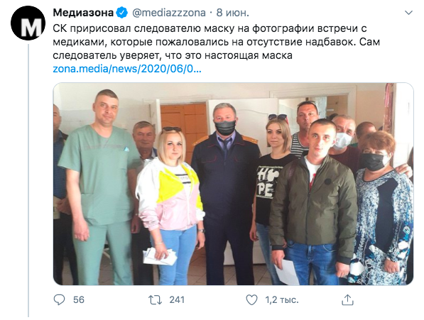 В России дорисовали маску следователю, который фотографировался с медиками в больнице скорой помощи. Чиновник посещал медицинское учреждение в связи с жалобами на нехватку средств защиты и отсутствие выплат за работу с больными коронавирусом.