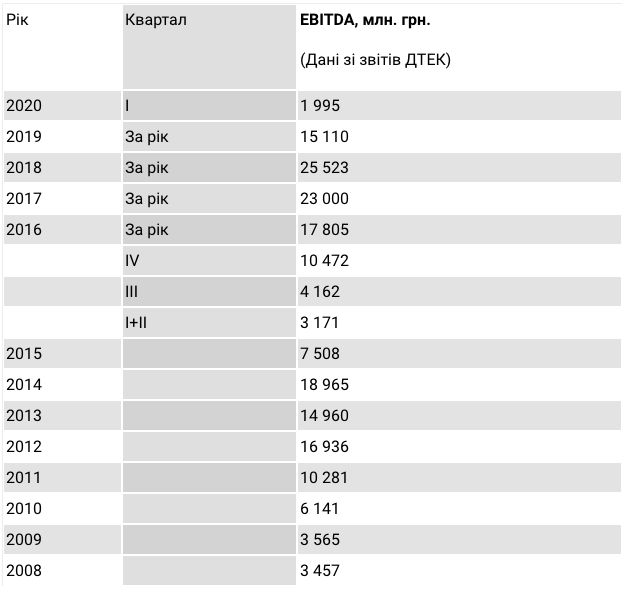 Енергетичний холдинг ДТЕК Ріната Ахметова в першому кварталі 2020 року отримав операційний прибуток до сплати процентів, податків та амортизації (EBITDA) в розмірі 2,00 млрд грн., що дозволило отримати рентабельність по EBITDA 14,6%.