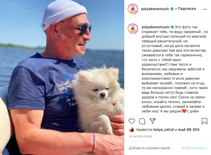 "Это фото так отражает тебя: по виду свирепый, но добрый внутри. Сильный, но мягкий, твердый, решительный, но уступчивый, когда дело касается твоих девочек! Как все эти качества уживаются в тебе так гармонично, что жить с тобой одно удовольствие? Нам тепло и безопасно, мы окружены заботой и вниманием, любовью и комплиментами! И если девочки выбирают мужей, похожих на отца, то им несказанно повезет, хотя таких ведь больше нет. Будь главное здоров и полон сил! Скачи на своих конях, играй в теннис, занимайся любимым делом, плавай в заливе и люби нас! А мы рядом!", – написала Полякова.