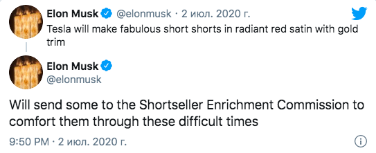 В начале июля Илон Маск обещал выпустить шорты, когда капитализация компании превысит 200 миллиардов долларов. Такой ход является частью шутки над «шортерами» — держателями коротких позиций на рынке, которые покупают и продают акции Tesla, надеясь на снижение цены, чтобы потом выкупить их назад и получить прибыль. Часто те, кому не хватает определенных акций, громко критикуют компанию. Уже несколько лет Маск борется с «шортерами».