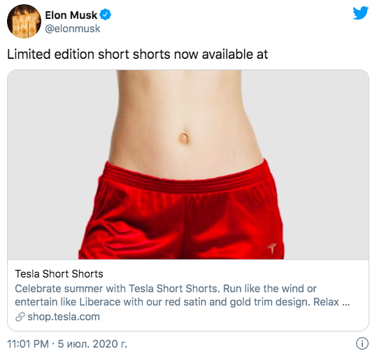 «Празднуйте лето с короткими шортами Tesla. Бегите, как ветер. [...] Отдыхайте у бассейна или в помещении круглый год в наших шортах Tesla, с фирменным логотипом спереди и надписью «S3XY» сзади. Тираж ограничен. Наслаждайтесь исключительным комфортом», — говорится на сайте.