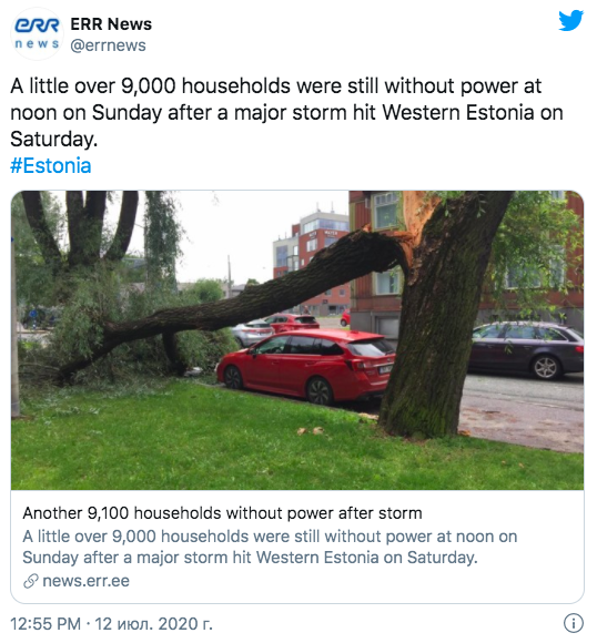 На Эстонию 11 июля обрушился шторм. Больше всего пострадали западные регионы Рапламаа и Йыгевамаа, а паромное сообщение с островом Хийумаа пришлось приостановить.