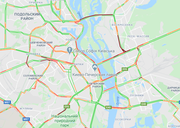 На мосту Метро, мосту Патона, а также Дарницком и Южном мостах движение затруднено в направлении правого берега. Самая сложная ситуация на Северном мосту. Об этом свидетельствуют данные Google Maps.