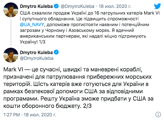 «Шесть катеров уже готовятся для Украины в рамках оборонной помощи США по соответствующим программам. Остальные Украина сможет приобрести у США за счет оборонного бюджета», — заявил Кулеба.