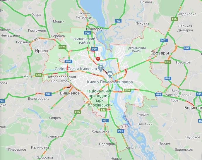 Существенные пробки образовались на проспекте Победы в районе цирка и станции метро "Университет" по направлению к Бессарабке. Большая пробка - на Жилянской от перекрестка на улице Черновола до перекрестка на улице Пестеля. Также значительный затор тянется по улице Лобановского от Севастопольской площади до перекрестка на улице Брянская.