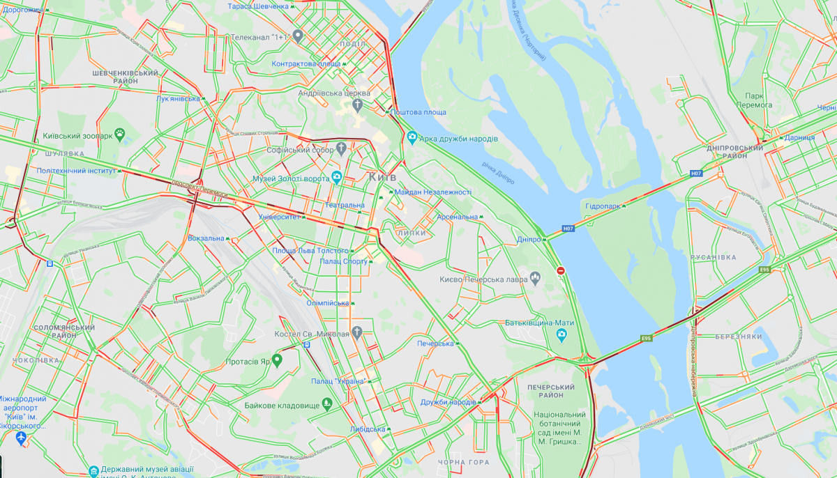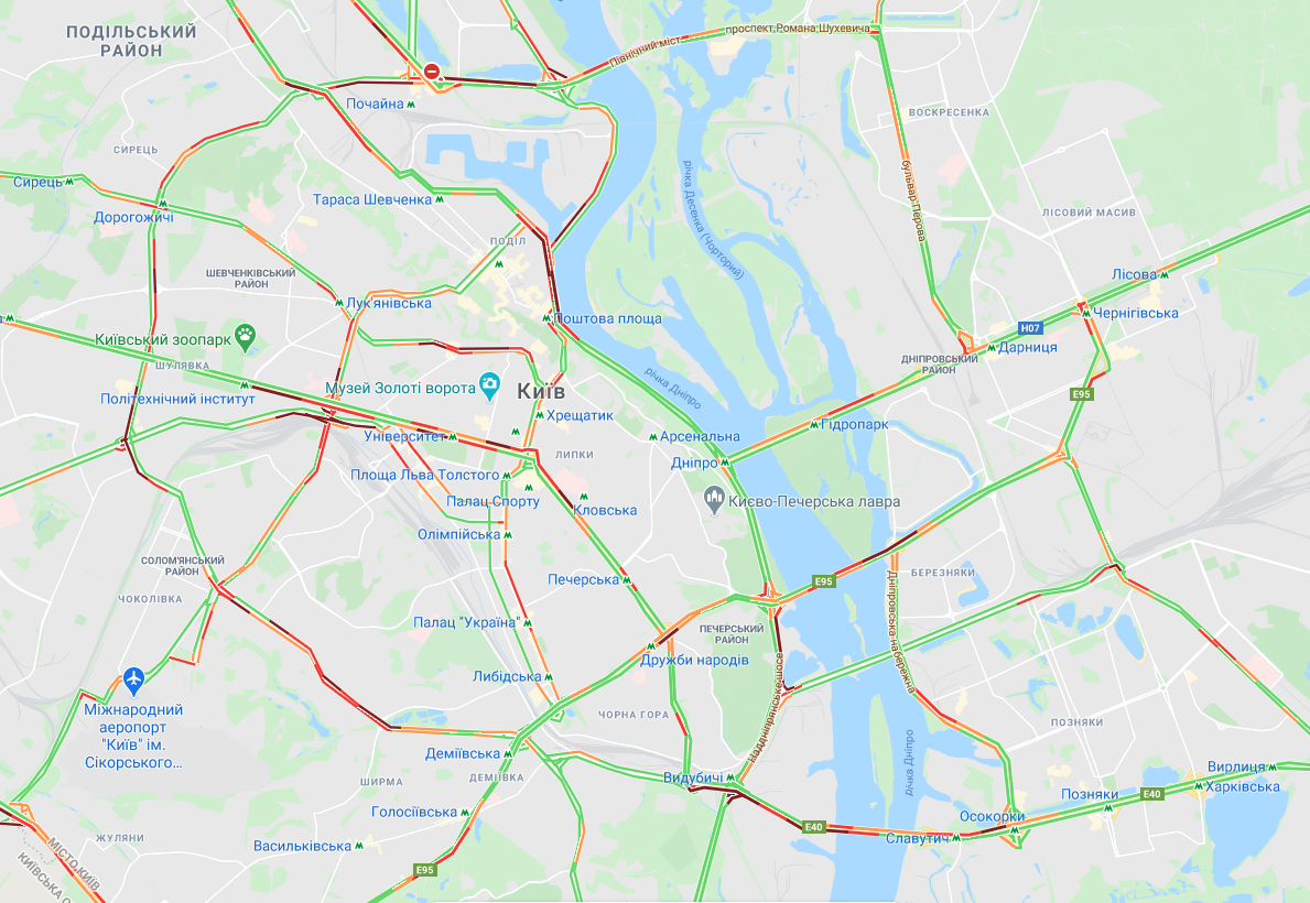 В Киеве утром в среду, 26 августа, ситуация на мостах через Днепр складывается следующая: Северный мост движется свободно в сторону левого берега, и наблюдается пробка по направлению на правый берег из-за большого скопления автомобилей при съезде в сторону Оболони, Мост Метро движется свободно в сторону левого берега, а в сторону правого берега трафик очень плотный и наблюдается тянучка, на мосту Патона наблюдается пробка в обоих направлениях, на Дарницком мосту движение свободное в обоих направлениях, Южный мост - тянучка и плотный трафик наблюдается в направлении центра города, а вот в сторону левого берега - пробка, и начинается она еще на Саперно-Слободской улице перед развязкой на Выдубичах. Проспект Бажана перед мостом едет плотно и медленно от "Осокорков". Об этом свидетельствуют данные Google Maps.
