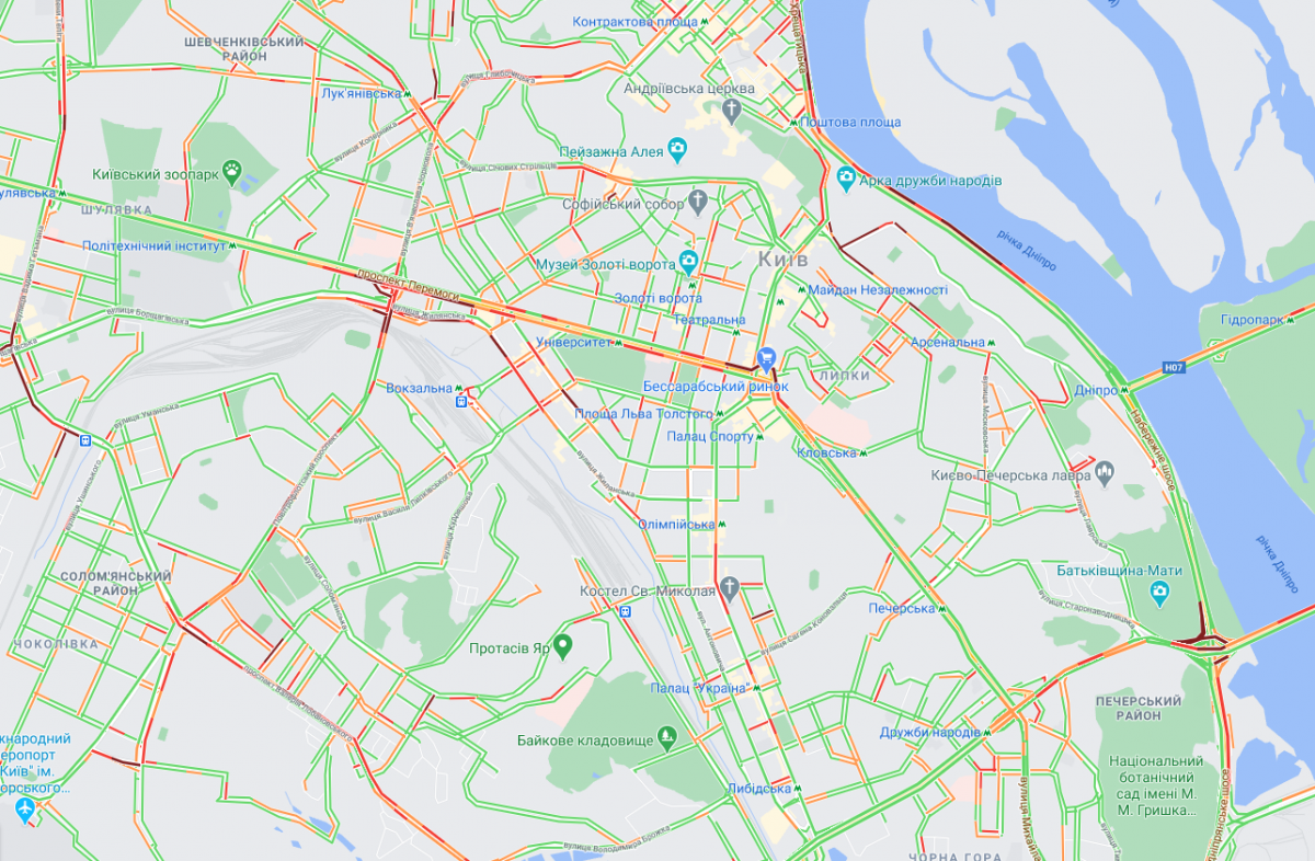 Плотное движение и местами пробки - на проспекте Валерия Лобановского, пробка есть и на улице Вадима Гетьмана в сторону Караваевых дач. На левом берегу традиционно пробки возникли на некоторых подъездах к мостам через Днепр. Наибольшие проблемы - на проспекте Бажана, а на проспектах Соборности и Броварском незначительные тянучки.