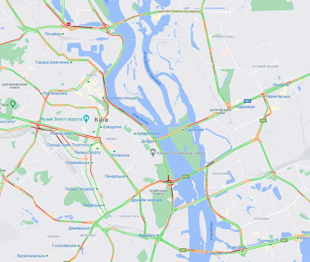 Утром в пятницу ситуация на мостах через Днепр складывается следующая: Северный мост движется свободно в обе стороны, пробочка лишь на съезде на проспект Героев Сталинграда в сторону Оболони, Мост Метро движется свободно в сторону левого берега, а в сторону правого берега трафик плотный, небольшой затор - при подъезде к переправе со стороны "Левобережной", на мосту Патона также пока не наблюдается значительных трудностей, трафик достаточно плотный в сторону центра города, но пробка есть на развязке на правом берегу и тянучка на развязке на левом, на Дарницком мосту движение достаточно свободное, но скопление автомобилей в сторону левого берега все же есть, Южный мост традиционно не спешит в направлении центра города. Основная пробка на проспекте Бажана перед мостом и начинается еще при подъезде к "Осокоркам". Об этом свидетельствуют данные Google Maps.