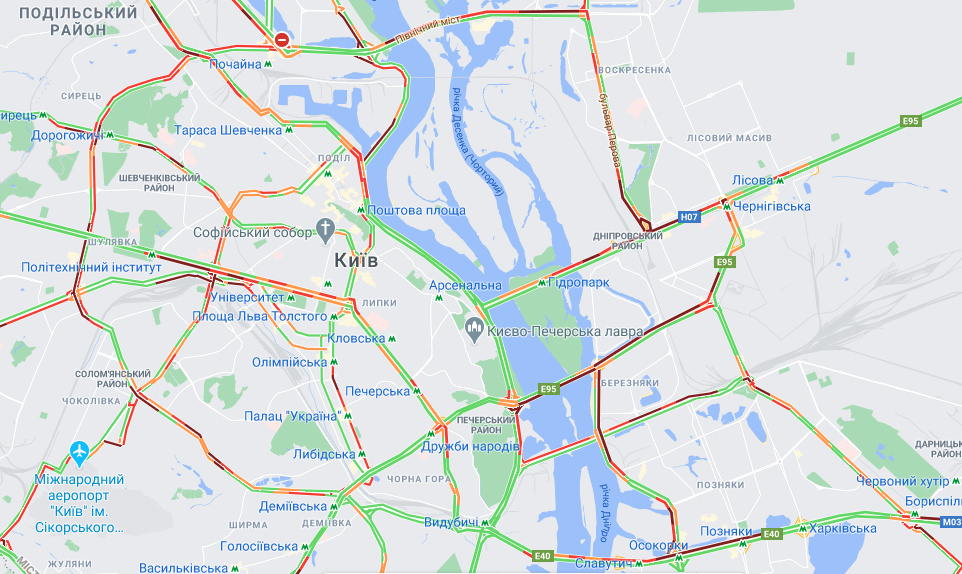 Также традиционная пробка - при подъезде к "Черниговской" по улице Братиславской. Также огромная пробка собралась на проспекте Соборности - он стоит в сторону правого берега от моста и до Дарницкой площади, и продолжается на проспекте Гагарина. Из-за проблем на Соборности стали в пробках прилегающие улицы на Березняках А Днепровская набережная стоит почти от Здолбуновской и до развязки на Патона.