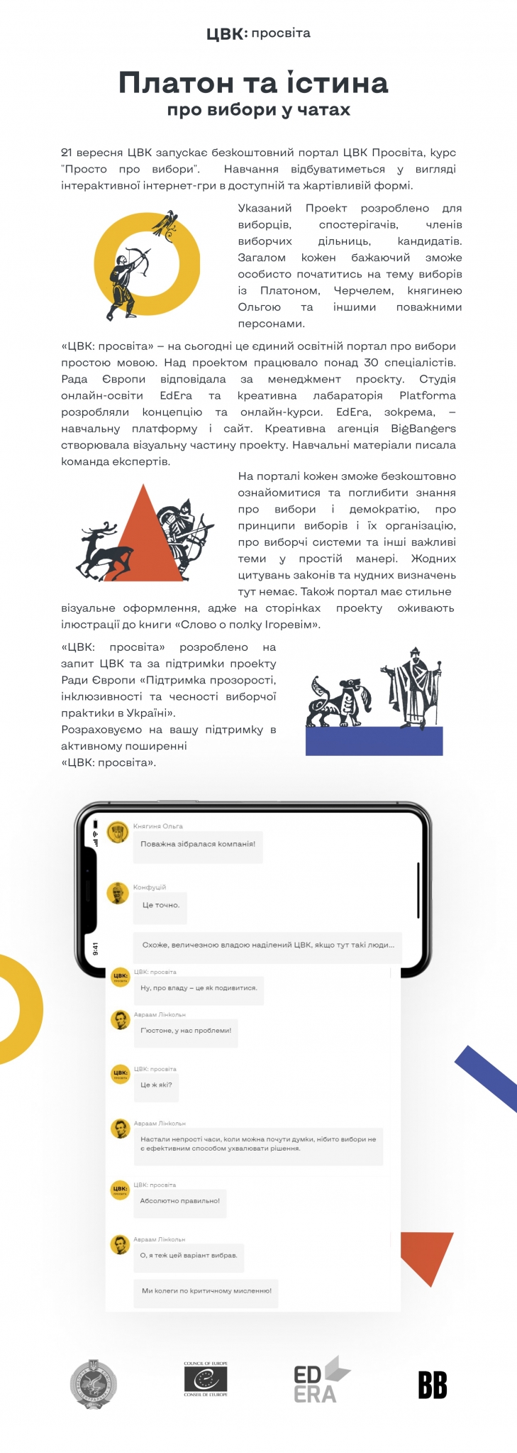 21 вересня ЦВК запускає безкоштовний портал "ЦВК: Просвіта", курс "Просто про вибори". Навчання відбуватиметься у вигляді інтерактивної інтернет-гри у доступній та жартівливій формі. Вказаний проєкт розроблено для виборців, спостерігачів, членів виборчих комісій, кандидатів. Загалом кожен бажаючий зможе особисто початитись на тему виборів із Платоном, Черчелем, княгинею Ольгою та іншими поважними персонами.