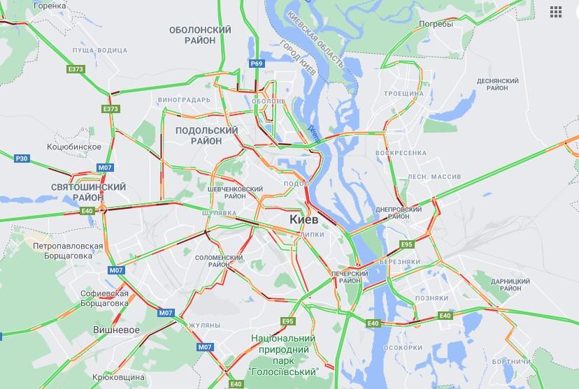 В пробке стоит Брест-Литовское шоссе в сторону Киева, затем - проспект Победы до Берестейской. Также проблемы на проспекте Валерия Лобановского, проспекте Любомира Гузара, Голосеевском проспекте.