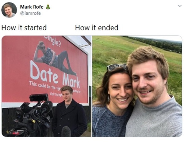 Маркетолог из английского города Шеффилд, 30-летний Марк Роф решил найти свою любовь необычным образом. Он арендовал билборд, на котором разместил свой снимок и надпись: "Одиноки? Встречайтесь с Марком. Это может быть знак, которого вы ждали". Также в рекламе был указан личный сайт мужчины.