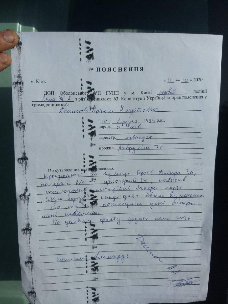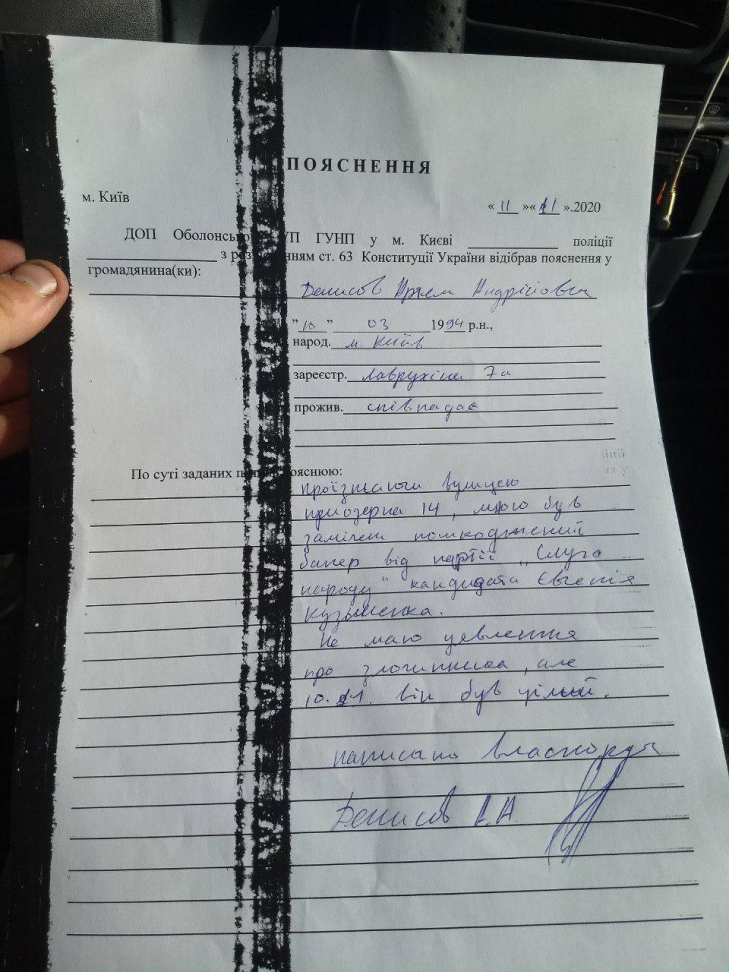 В связи с этим, доверенное лицо кандидата Евгения Кузьменко написало заявление в Оболонское районное управления ГУ Нацполиции Киева.