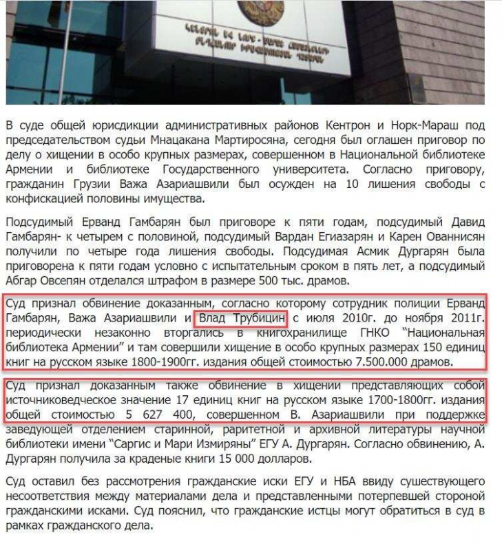 Об одном из эпизодов его деятельности свидетельствует приговор Ереванского суда от 26 декабря 2012 года: «Суд признал обвинение доказанным, согласно которому сотрудник полиции Ерванд Гамбарян, Важа Азариашвили и Влад Трубицин с июля 2010г. до ноября 2011 г. периодически незаконно проникали в книгохранилище ГНКО “Национальная библиотека Армении” и там совершили хищение в особо крупных размерах 150 единиц книг на русском языке 1800-1900 гг. издания общей стоимостью 7.500.000 драмов».⠀