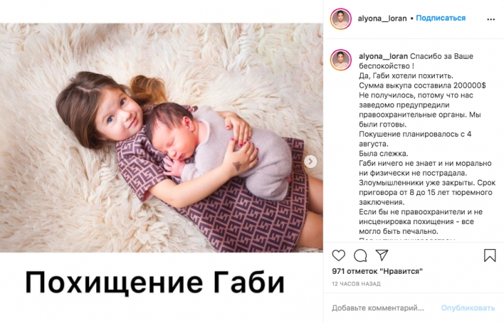 "Была слежка. Габи ничего не знает и ни морально, ни физически не пострадала. Злоумышленники уже закрыты. Срок приговора – от восьми до 15 лет тюремного заключения. Если бы не правоохранители и не инсценировка похищения – все могло быть печально. Под чутким руководством проводилась спецоперация. Мы безумно благодарны всем ребятам за то, что наша дочь в безопасности и все это время, пока я вела переговоры с похитителем, была в гостинице, смотря мультики, ничего не подозревая", – написала Лоран.