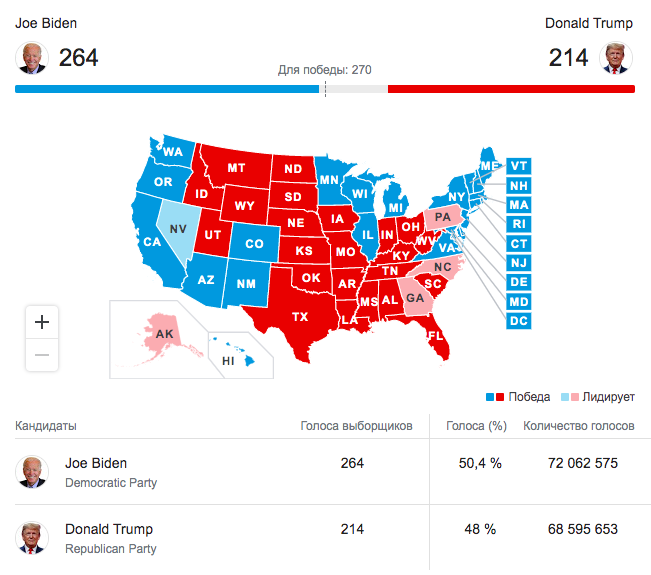 По состоянию на 7:25 Байден набирает 264 голоса, в то время как Трамп набирает 214 голосов.