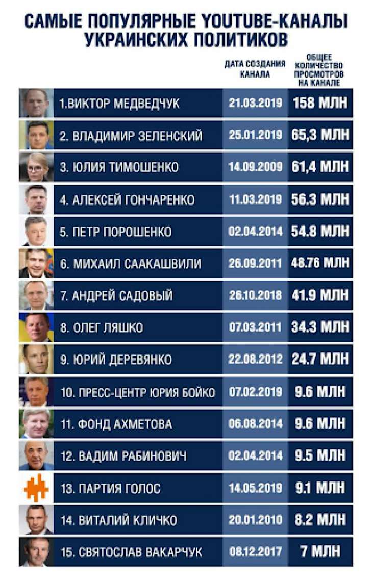 Канал главы политсовета «Оппозиционной платформы – За жизнь», народного депутата Виктора Медведчука, занимает первое место среди украинских политиков, представленных на видеохостинге YouTube. Несмотря на то, что был создан недавно, 21 марта 2019 года, на канале уже больше 158 млн просмотров.