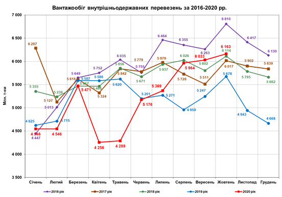 Положительные новости есть и в сфере грузовых перевозок. Не дожидаясь инвестиций 2021 года, новой команде удалось наладить высокие объемы грузоперевозок уже в этом году. По данным на октябрь 2020 года, грузооборот на внутреннем сообщении «Укрзализныци» составил 6163 млн т/км. Это рекордный показатель за последние три года, и он продолжает расти.