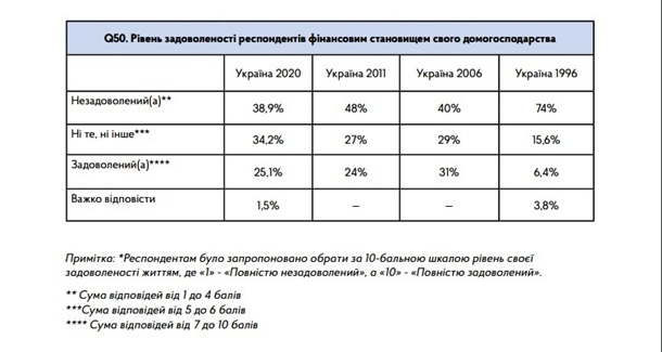 Жителей Украины, считающих свое финансовое состояние неудовлетворительным, стало меньше - с 48% в 2011 году до 38,9% в 2020 году. Также больше украинцев начали считать себя счастливыми и стали меньше уважать власти, говорится в глобальном исследовании World Value Survey, представленном Украинским центром европейской политики.