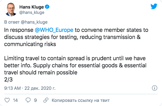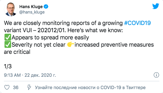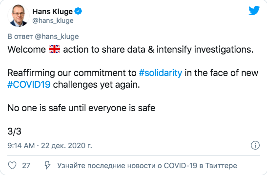 Он также отметил, что: "Мы продолжаем изучать данные о вспышке новой мутации COVID-19 — VUI — 202012/01. Что нам известно на данный момент: вирус легче распространяется; тяжесть еще не ясна, усиление превентивных мер имеет решающее значение".