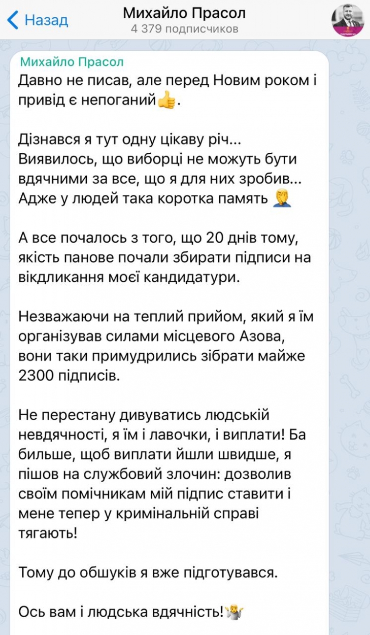 Аналогичная информация о собранных подписях об отзыве кандидатуры Михаила Прасола появилась и в телеграмм Канале «Михаил Прасол - Ваш кандидат», который был создан в период начала предвыборной гонки в местный совет Запорожья.