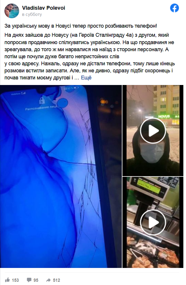 «На днях зашел в Новус (на Героев Сталинграда, 4а) с другом, который попросил продавщицу общаться на украинском. На что продавец не среагировала, к тому же, мы нарвались на наезд со стороны персонала. А потом еще услышали очень много неприличных слов в свой адрес. Как ни странно, сразу подбежал охранник и начал тыкать моему другу и рассказывать, что «ЗДЕСЬ ТАК РАЗГОВАРИВАТЬ НЕ БУДЕШЬ, ВЫХОДИТЕ И РАЗГОВАРИВАЙТЕ СКОЛЬКО ХОТИТЕ», и выбил телефон из рук, когда мы решили записать разговор на видео», - написал Владислав.