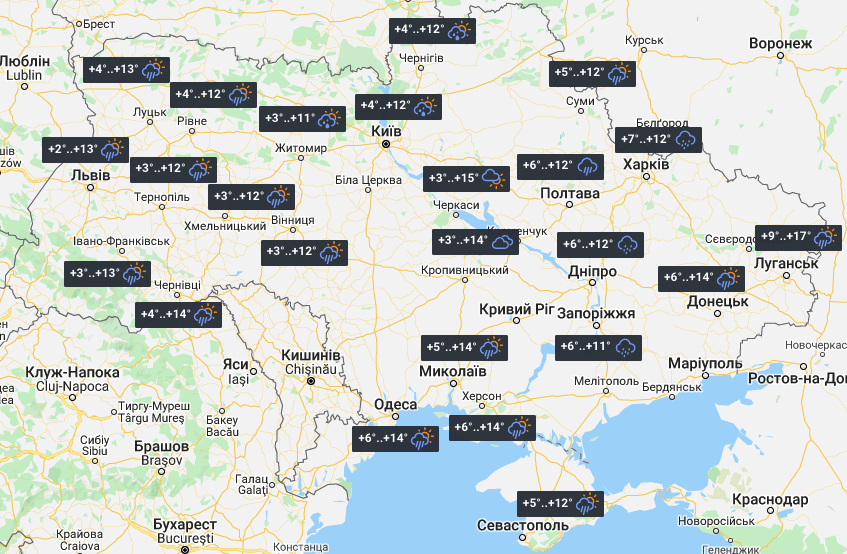 В Херсоне во вторник ночью +6°, днем +14°, облачная погода с прояснениями, ливень. В Николаеве сегодня будет облачно с прояснениями, ливень, ночью +5°, днем +14°. В Запорожье - дождь, температура ночью +6°, днем +11°. В Сумах сегодня облачно с прояснениями, ливень, температура воздуха +5°...+12°. В Харькове - дождь, температура ночью +7°, днем +12°. В Днепре - дождь, температура ночью +6°, днем +12°. В Симферополе во вторник - облачно с прояснениями, ливень, 5°...+12°. В Краматорске будет облачно с прояснениями, температура ночью +6°, днем +17°. В Северодонецке - облачно с прояснениями, температура ночью +7°, днем +17°.