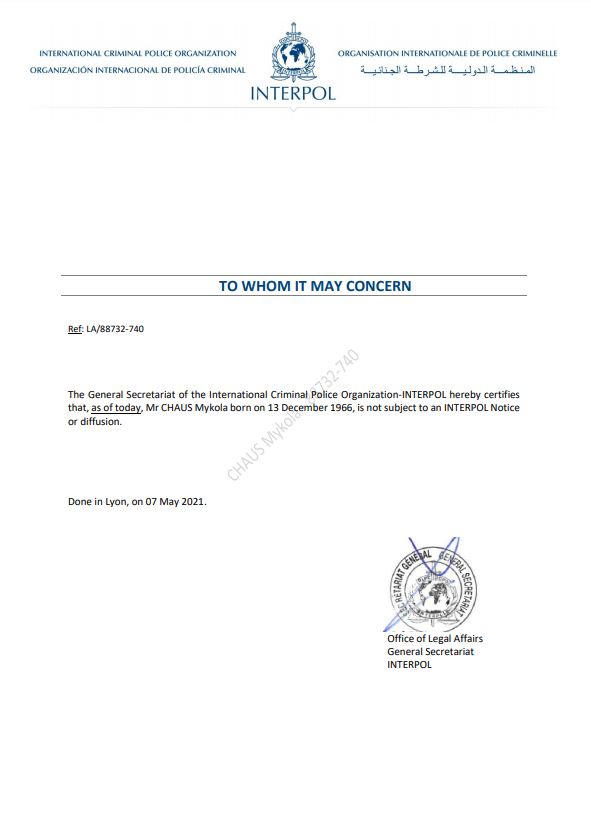 Інтерпол офіційно перестав розшукувати екс-суддю Миколу Чауса ще 7 травня. Про це свідчить документ, який з’явився у ЗМІ 17 травня.