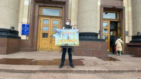 Житель Харькова с огромным баннером «Остановите Газомор» вышел на акцию протеста под стены областной администрации. По его словам, высокие тарифы на газ, из-за чего он не может позволить себе обогревать жильё, вынудили его выйти на пикет. Ввиду наступления холодов его семья, где проживают двое маленьких детей, а также 83-летний дедушка, вынуждена мерзнуть. Низкие заработные платы не позволяют мужчине погасить платежку в 60 тысяч гривен за подключение к газу.