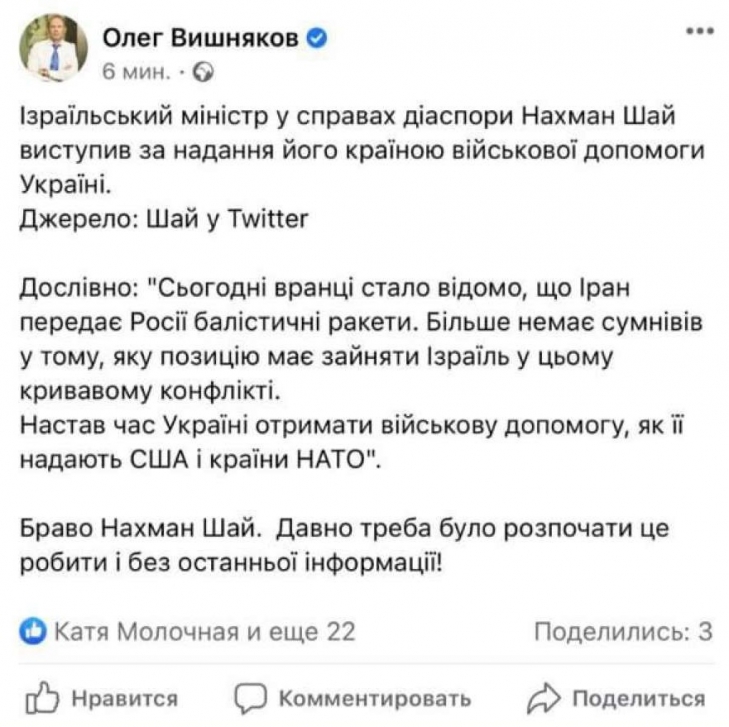 «Більше немає жодних сумнівів, якою має бути позиція Ізраїлю в цьому кривавому конфлікті. Настав час Україні отримати також військову допомогу – таку, як надають США та країни НАТО», – написав міністр.