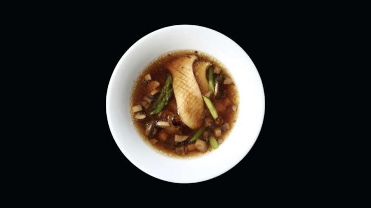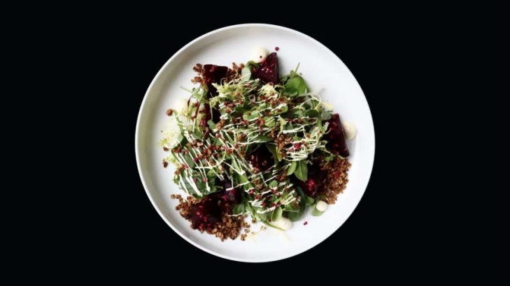 Закуски – овочевий террін з обсмажених на грилі болгарського перцю, цукіні, баклажану й томатів, та салат з печеним буряком, гранолою та тофу-майонезом. Для салату шеф запікає буряк у солі та подає у малиновому соусі, додає гранолу з розмарином та майонез із сиру тофу. Майонез має право на життя тоді, коли він дійсно healthy.