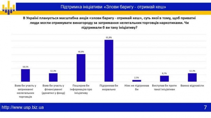 Українська соціологічна платформа опублікувала дослідження на тему боротьби з наркоторгівлею в Україні. За його результатами лише п'ять відсотків українців вважають, що держава дуже ефективна в протидії розповсюдженню наркотиків. Переважна більшість респондентів називають роботу в цьому напрямку не дуже або взагалі не ефективною.