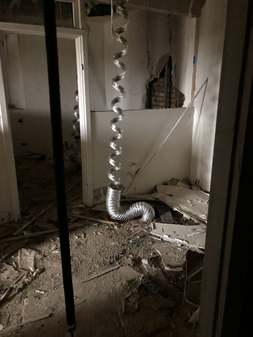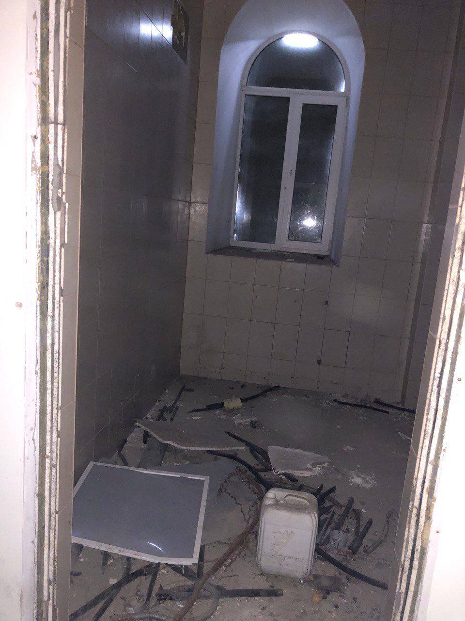 На фото видно понищене майно, зруйновані стіни, видерті двері та понівечене покриття підлоги.