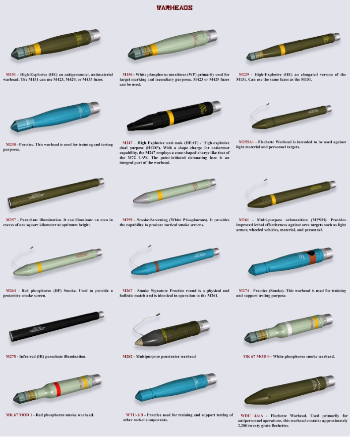 Hydra — це модульний боєприпас, що складається зі стандартизованого 70-мм ракетного двигуна, до якого можна прикріпити різні боєголовки. Ракети на відео виглядають як типові некеровані ракети з фугасними боєголовками. Також доступні різні інші боєголовки, включаючи протитанкові та протипіхотні типи, заряджені тисячами металевих дротиків, які називаються “флешетами”, але незрозуміло, які з них отримали українські війська.
