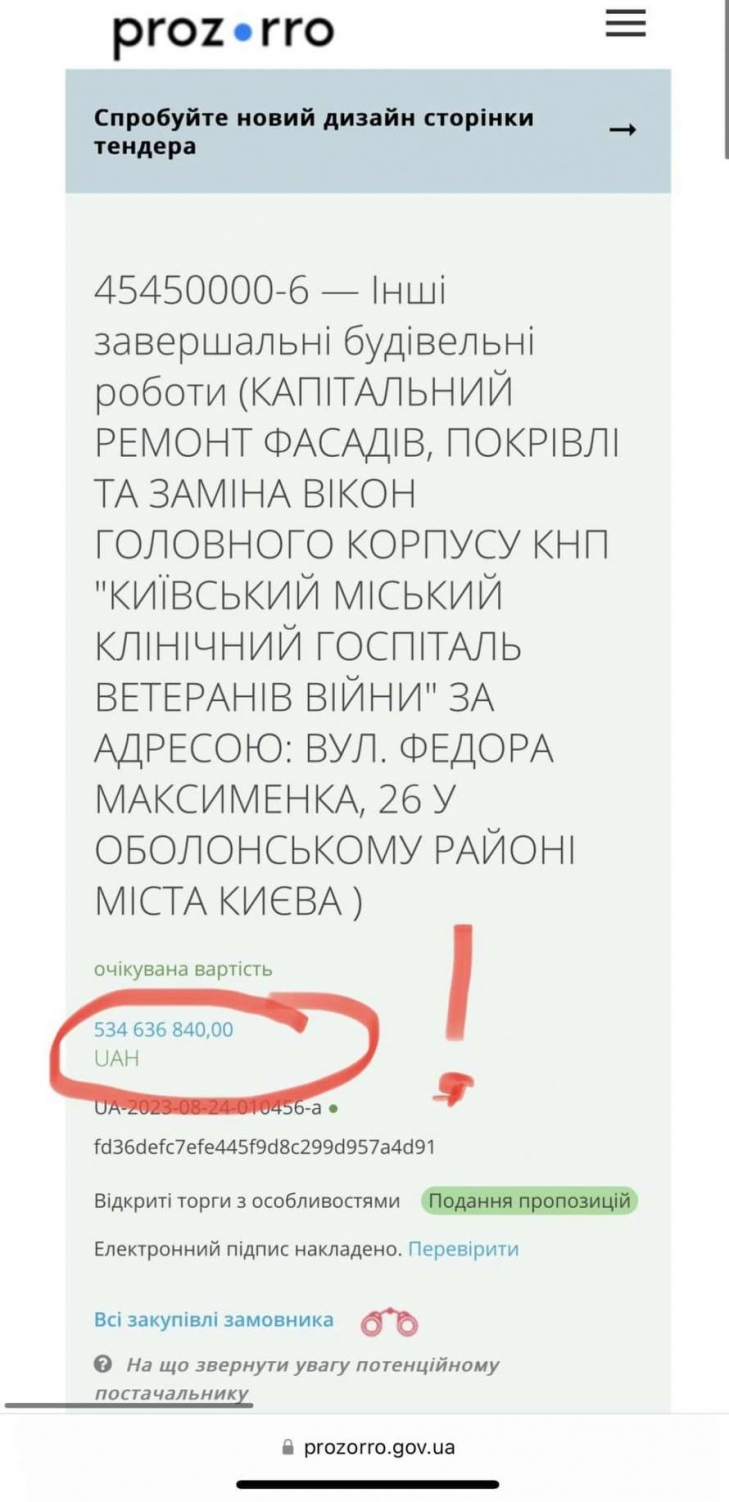 «За цю суму планують оздобити фасад металевим сайдингом, покрівлю закатати руберойдом та встановити нові металопластикові вікна. Пишуть, що в госпіталі всі вікна вже й так металопластикові. Но їх вирішили замінити на інші металопластикові вікна. Навіщо? Але зараз вже замінюють вікна в рамках ремонтів окремих поверхів, які йдуть на додачу (!) до цих 534 мільйонів. Тендер тільки сьогодні з’явився на Прозорро (посилання на ідентифікатор у першому комменті), на опрацювання пропозиції дали всього тиждень, до 1 вересня приймають пропозиції, а 4.09 визначають щасливого переможця, який до 31.12.23 повинен ще встигнути освоїти гроші. Замовник: Комунальне підприємство «Київський міський клінічний госпіталь ветеранів війни» виконавчого органу Київської міської ради (КМДА). Але здається, що якщо у київської влади є зайві пів мільярда для ветеранів, то можно іх потратити більш ефективно. А ця закупівля дуже попахує заміною цілком ще нормальної брухівки поруч з Крещатиком, яка вже стала символом марнотратства та мародерства під час війни. Або дійсно в госпіталі так погано з вікнами, може хто просвітить…?», - написав у Facebook Олександр Соколовський.