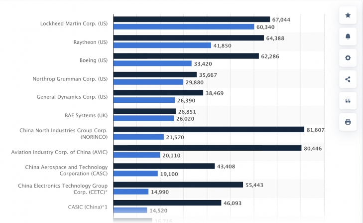 До того ж найбільші компанії з виробництва зброї та військових послуг знаходяться саме в США. (дані Statista за 2021 рік в млн американських доларів).