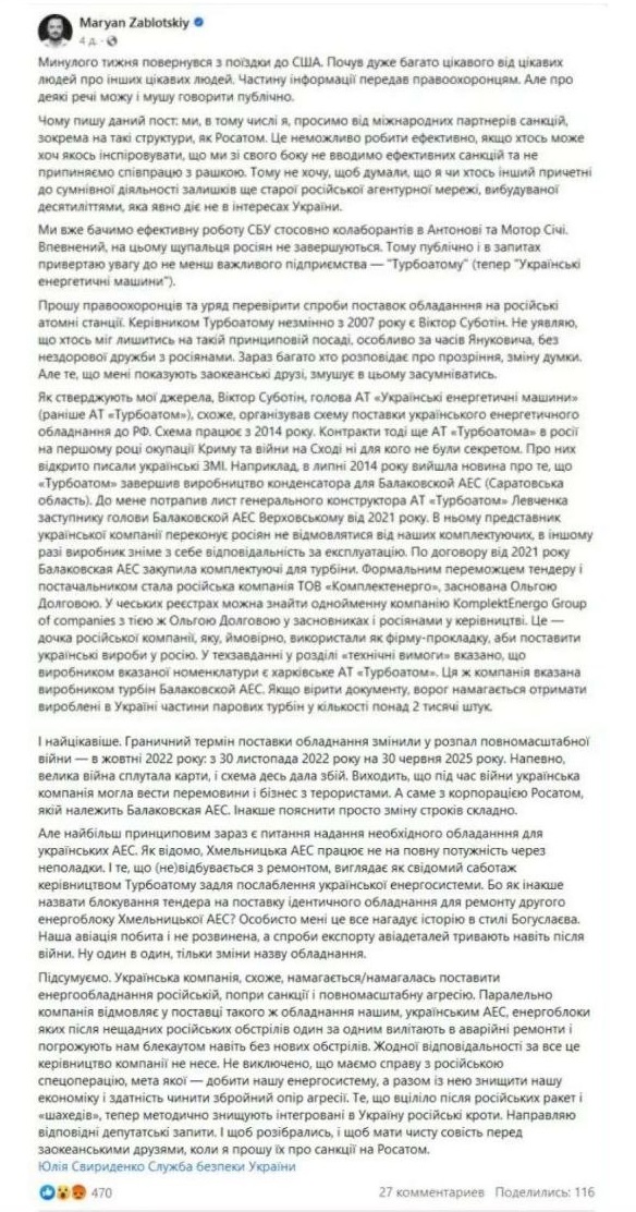 АО "Украинские энергетические машины", до недавнего времени АО "Турбоатом", которым с 2007 года руководит Виктор Субботин, довольно плотно сотрудничает с россией. Об этом сообщил народный депутат Марьян Заблоцкий. С его слов, он уже обратился в правоохранительные органы. Судя по всему, "Турбоатом" не перестал торговать с "Росатомом" даже после начала полномасштабного вторжения российских оккупантов на территорию нашей страны. Как утверждает Заблоцкий, у них есть действующий контракт на поставку оборудования для Балаковской АЭС (Саратовская обл.), пишет издание "ОРД".