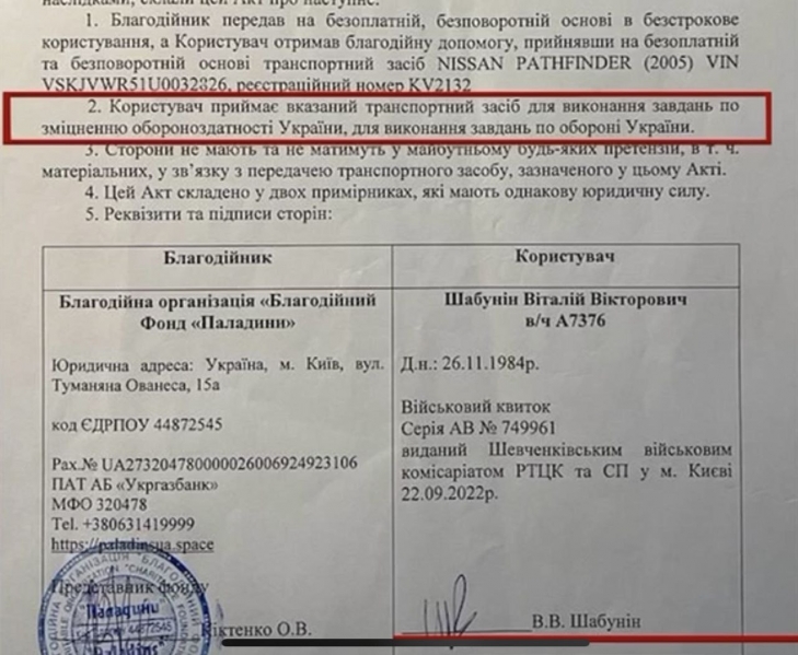 «Влітку 2023 року благодійний фонд передав у військову частину А7376 (207 окремий батальйон ТрО 241 окремої бригади ТрО) автомобіль Nissan Pathfinder, який прийняв стрілець 1 стрілецької роти цього батальйону, солдат Шабунін. На облік у військовій частині автомобіль поставлений не був і коли солдат Шабунін переводився на посаду бойового медика взводу охорони 101 бригади, він цей джип забрав із собою. Більш того, військовослужбовець Шабунін щодня їздить на цьому авто по Києву й навіть вніс автомобіль у свою декларацію, як наданий йому у безстрокове безкоштовне користування», - зазначає журналіст.