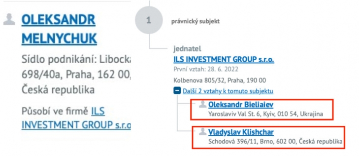 Помимо Мельничука соучредителями данной компании, согласно чешскому реестру юридических лиц, в равных долях с ним являются уроженец Кривого Рога Александр Беляев и Владислав Клищар из Белой Церкви, имеющий также регистрацию в чешском городе Брно. Сопровождает деятельность Клищара, Мельничука и Беляева чешский адвокат Petr Vališ.