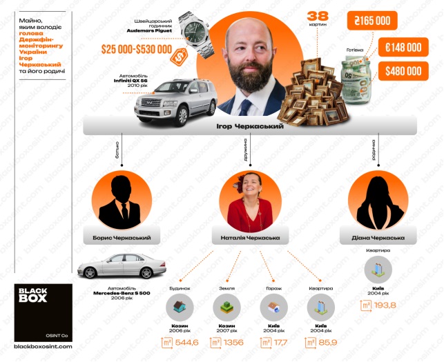 Майно голови Державної служби фінансового моніторингу України Ігоря Черкаського та його родини. Інфографіка BlackBox OSINT