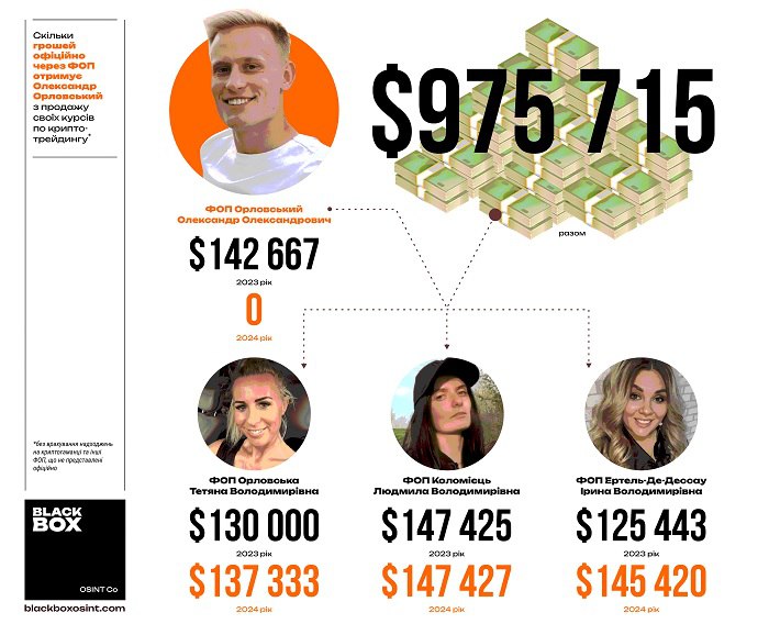 Як підрахували Стокорупційні розслідування BlackBox OSINT, на цьому Орловський тільки за офіційними даними чотирьох ФОП, які він використовує для прийняття оплати за свої послуги, за два останні роки заробив близько мільйона доларів США. Це не враховуючи ще грошей, які він отримує у вигляді криптовалюти на свої криптогаманці, які жодним чином не оподатковуються та які дуже складно відслідкувати.