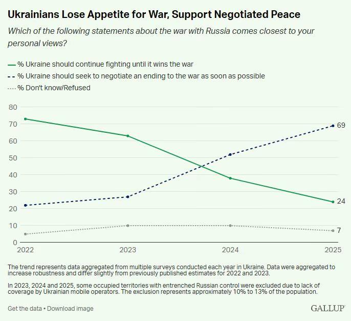 Я не знаю, було це збігом чи ні, але невдовзі після анонсу зустрічі Трампа з Путіним на Алясці Gallup одна з найповажніших міжнародних організацій, що досліджує громадську думку, оприлюднила результати дослідження щодо ставлення українців до опцій завершення війни.
