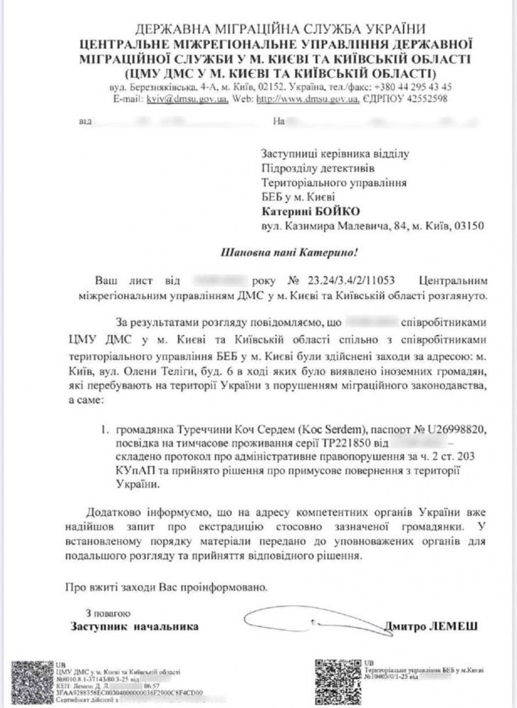 ФОТО: Копія Листа ДМС про екстрадицію Коч Сердем