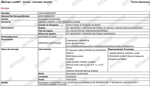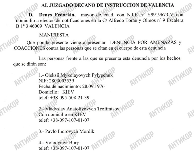 Після загострення ситуації Федоркін був змушений звернутися до іспанських правоохоронних органів, подавши офіційну заяву про погрози й вимагання в липні 2024 року. Згідно з документом, поданим через систему LexNET, він звинуватив чотирьох осіб – Пиличука, Трофімцова, Мордіка та Бурого – у погрозах і примусі та надав дані про їхні контакти, дії та зв’язки. Іспанське провадження кваліфіковане як справа про amenazas condicionales - погрози, що передбачають вимагання вигоди в обмін на ненастання шкоди.
